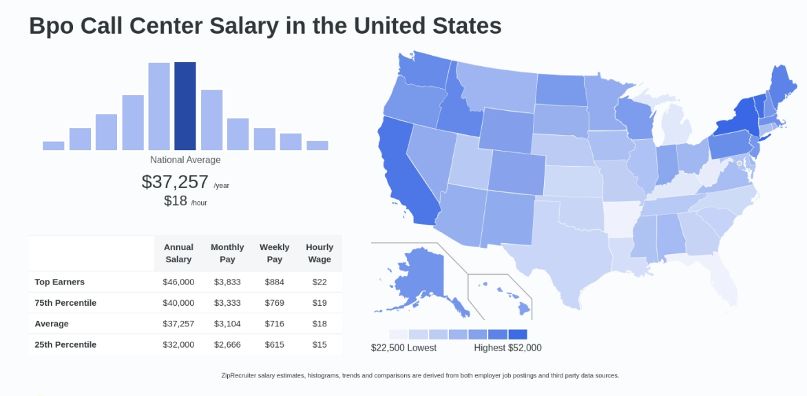 To estimate the most accurate hourly salary range for Bpo Call Center jobs, ZipRecruiter continuously scans its database of millions of active jobs published locally throughout America.